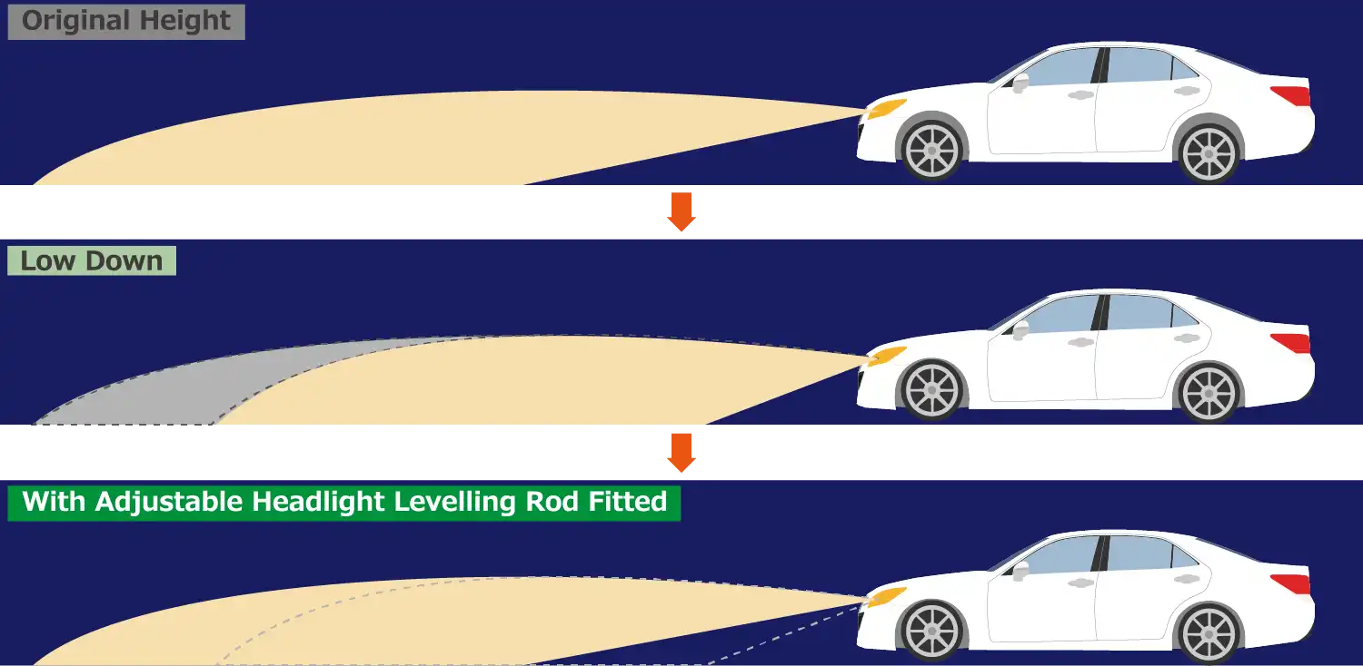 When the ride height is lowered, many of models with self-leveling headlights falsely recognize that only the rear side is lowered (the car is tilted backwards), since the sensor is only attached to the rear end. This causes the headlight axis to be automatically adjusted downward, only to light the near side as a result. With this Adjustable Headlight Leveling Rod installed, the angle of headlight level sensor is corrected close to that of OE, and hence the headlight is kept at appropriate angle.