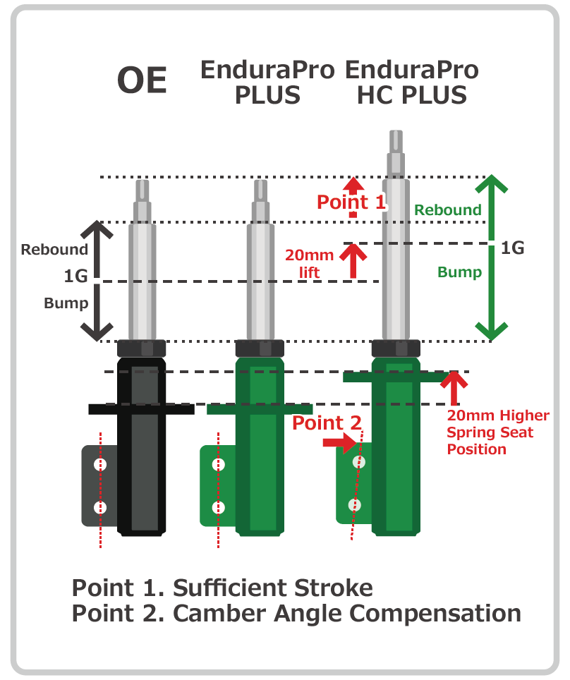 EnduraPro HC PLUS allows for 20mm lift, by changing the spring seat position based on the original shock absorber design.