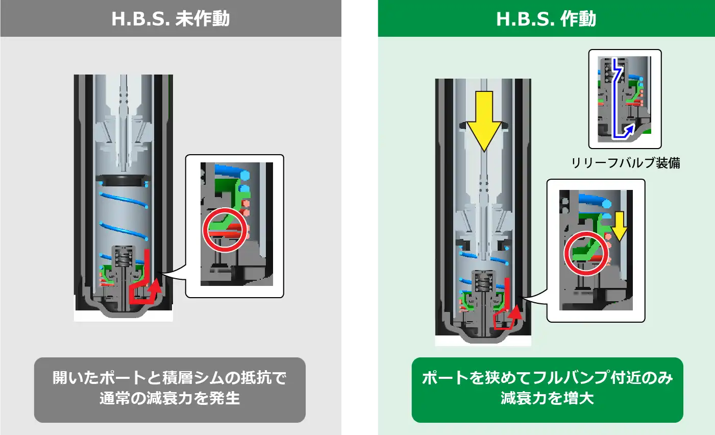 しかし、決まった位置を超えてストロークすると、右図のように作動バルブが押し下げられてH.B.S.が作動。ポートを狭めてオイルを流れにくくすることで、フルバンプ付近でのみ高い減衰力を生み出します。